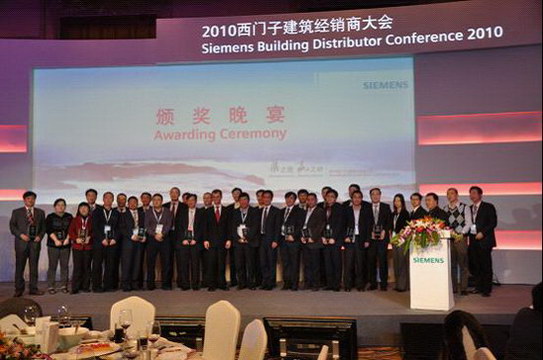 在西門子(中國(guó))有限公司舉辦的成都青城山“2010西門子樓宇科技集團(tuán)經(jīng)銷商大會(huì)”期間我公司喜獲“西門子建筑CPS BU佳經(jīng)銷商獎(jiǎng)”。